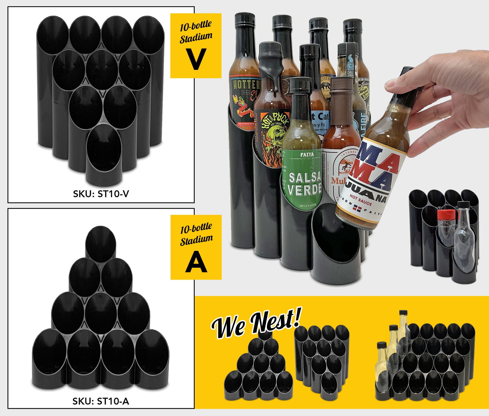 The coordinating Sauce Caddy Daddy Stadium Series nest together seamlessly for a dramatic display of your hot sauce assortment.